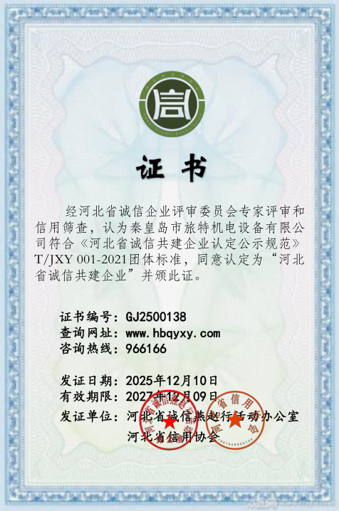 經(jīng)河北省誠信企業(yè)評審委員會專家評審和信用篩查,認(rèn)定為秦皇島市旅特機(jī)電設(shè)備有限公司符合《河北省誠信共建企業(yè)認(rèn)定公示規(guī)范》T/JXY001-2021團(tuán)體標(biāo)準(zhǔn),同意認(rèn)定為‘’河北省誠信共建企業(yè)”并頒此證。此次榮譽(yù)的獲得肯定了公司誠信經(jīng)營促進(jìn)行業(yè)健康發(fā)展所做的努力。公司將繼續(xù)以“誠信得天下,匠心鑄輝煌”的企業(yè)經(jīng)營理念,不斷提升企業(yè)誠信建設(shè)工作水平,努力將企業(yè)做大做強(qiáng)做優(yōu),爭做標(biāo)桿企業(yè),發(fā)揮榜樣作用。
